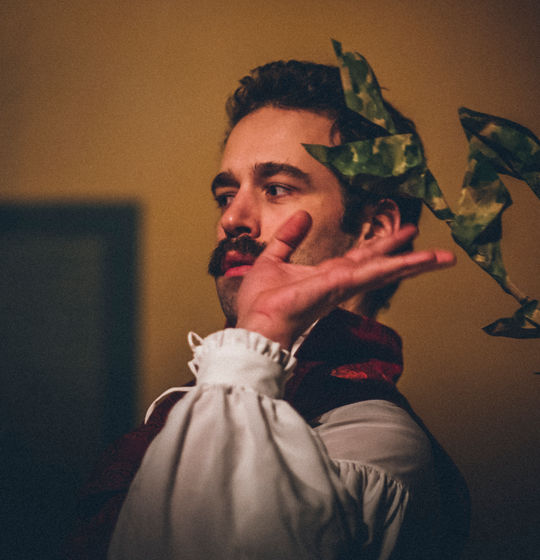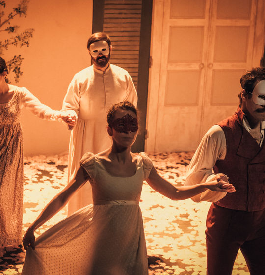 Quanto mais de perto olharmos para este mundo, mais bizarro ele nos parece. O vilão Dom João cria o caos quando difama a promiscuidade de Hero, a filha de Leonato, governador de Messina. Dom Pedro, por sua vez, desenha um plano casamenteiro para Beatriz e Benedito, que repudiam o matrimónio, e a pacatez da casa de Leonato é transformada num baile mascarado de fingimentos e mentiras. Shakespeare compôs os episódios de engano com engenho: a bisbilhotice, a correspondência trocada, o baile, as máscaras, o teatro, são elementos que compõem uma escadaria de engano — tanto verbal como visual — e o resultado é uma comédia extraordinária que compreende que a impostura e a ilusão são requisitos obrigatórios do entretenimento de uma vida pacata. Foi precisamente por aqui que comecei a trabalhar em Muito Barulho, a encontrar o paralelo de Messina com a minha juventude em Alenquer, onde a pacatez de um dia particularmente estéril era preenchida pela adrenalina de um “diz que disse”.